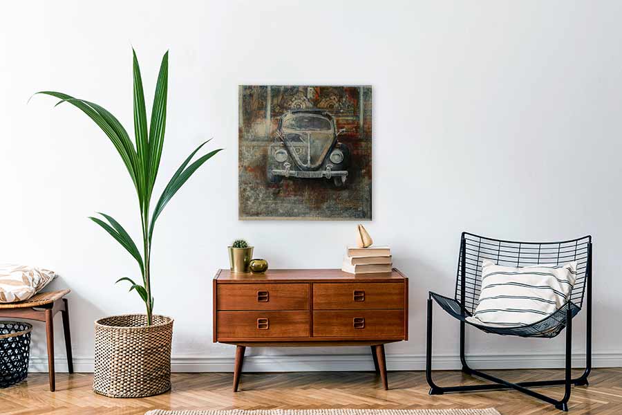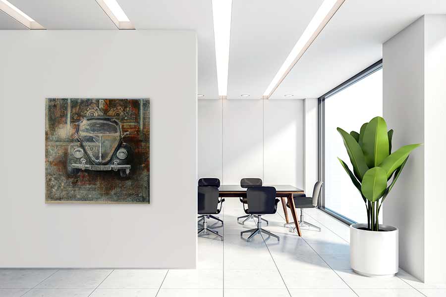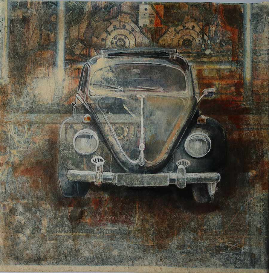 Jörg Extra malt und zeichnet Oldtimer und Youngtimer in einer eigens entwickelten Mischtechnik auf collagierter Leinwand. Auf einer speziell präparierten Leinwand werden Zeitungsexemplare der New York Times, der Washington Post oder des Figaro etc. aufgetragen und mit verschiedenen Techniken übermalt. Jedes Werk ist ein Unikat.