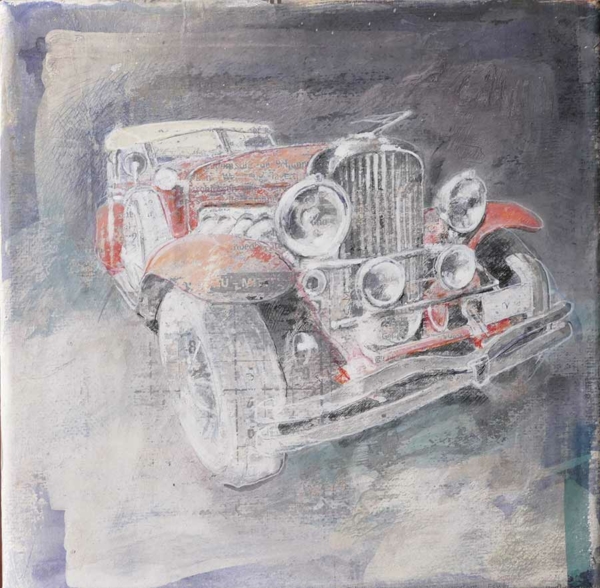 Jörg Extra malt und zeichnet Oldtimer und Youngtimer in einer eigens entwickelten Mischtechnik auf collagierter Leinwand. Auf einer speziell präparierten Leinwand werden Zeitungsexemplare der New York Times, der Washington Post oder des Figaro etc. aufgetragen und mit verschiedenen Techniken übermalt. Jedes Werk ist ein Unikat.